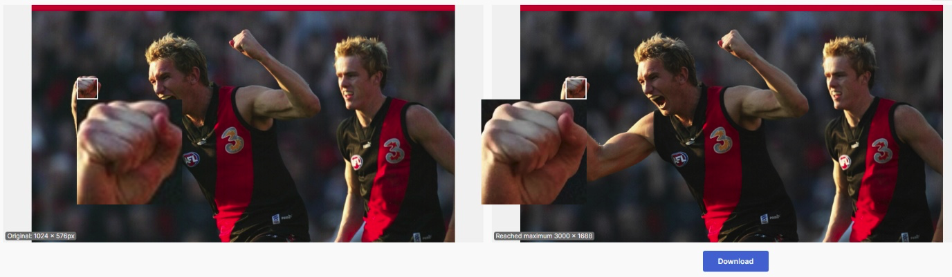 Below are two photos of former AFL footballer James Hird. On the left is the original low-res image, while on the right is the beefed-up upscaled image, which has a new resolution with about 8.6x the number of pixels. The right image uses the AI upscaler from icons8.com. In each photo, a white square allows you to easily look and compare both images. But as you know, pixels aren’t everything. If you look at the blown-up image of Hird’s right fist, you’ll notice how much clearer the right image is (and it’s far from subtle!).
