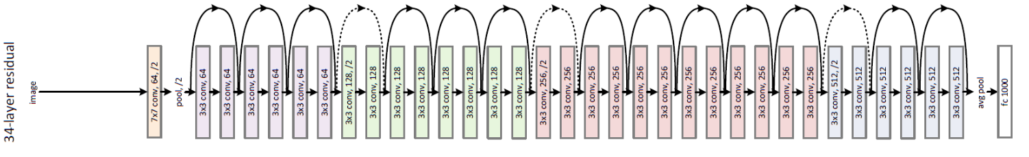 The ResNet-50 model is a 50-convolutional block (several layers in each block) deep learning network built on the ImageNet database. This model has over 175+ layers in total and is a very deep network. ResNet stands for Residual Networks. The following figure shows the typical architecture of ResNet-34.