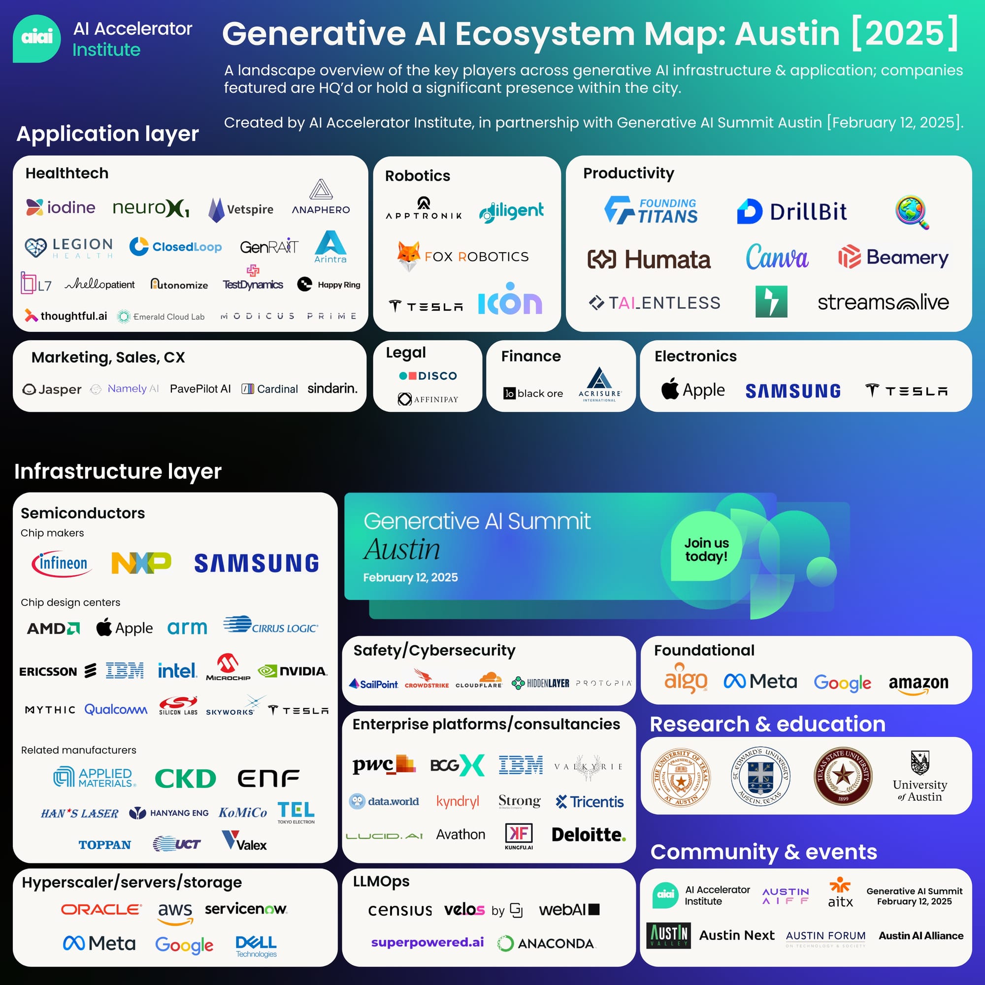 With the support of Austin AI Alliance & AustinNext, featured below is an ecosystem map of Austin's major players across both application and infrastructure: