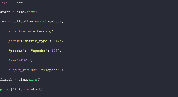 Now that we have the embeddings, we can query the database. For fun, I'm adding the `time` module to track how long these queries take. In this example, we measure the query time for 23 2048-dimensional vectors. To query Milvus, we simply use the `search` function with the embeddings generated above.