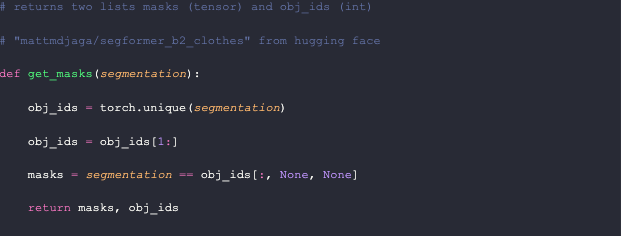 Getting the segmentation masks is straightforward from here. We obtain all the unique values in the segmentation; in this model, there can only be up to 18. We discard the first entry, which represents the background. To create the masks, we extract the pixels in the segmentation that have the same value as the object ID. I make this function return both the masks and the IDs so that we can keep track of both.