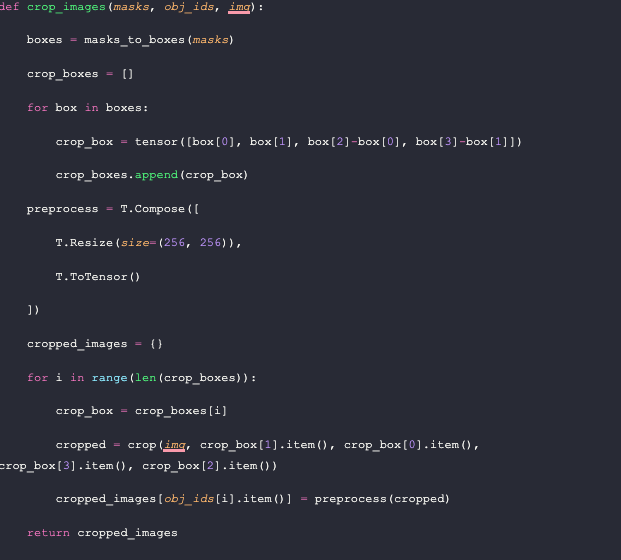 Before we crop the images, we also define a preprocessing function. We want to resize each image to 256x256 and convert them into PyTorch Tensors (currently PIL Images). Now it’s time to crop the images. We loop through the crop boxes and call the `crop` function on the image using the values we got earlier. Then we add the preprocessed image as the value corresponding to the key value of the segmentation id to a dictionary. At the end of the function, we return that dictionary.