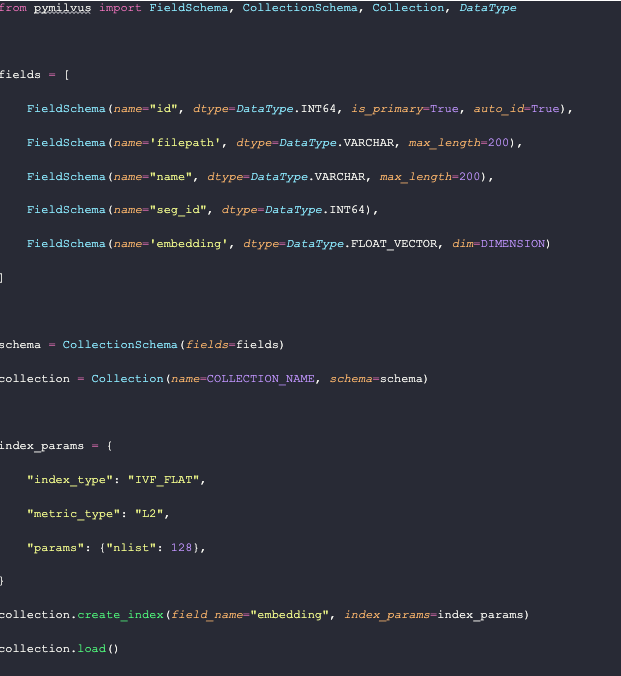 Now that we have a collection, let's define its index. These index parameters are pretty basic. We use IVF Flat with 128 centroids and L2 as the distance metric. We create the index in our collection, specifying that the `embedding` field is the one to operate on. Then, we load the collection into memory so that it is ready to be operated on.
