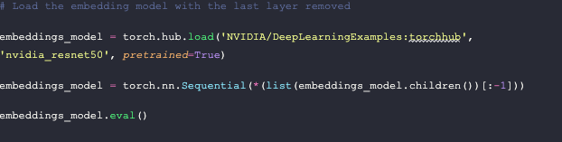 The first step in this section is to load the model. We load Nvidia’s ResNet50 model from PyTorch, then we cut off the output layer. Vector embeddings are the output of the second to last layer in a model.