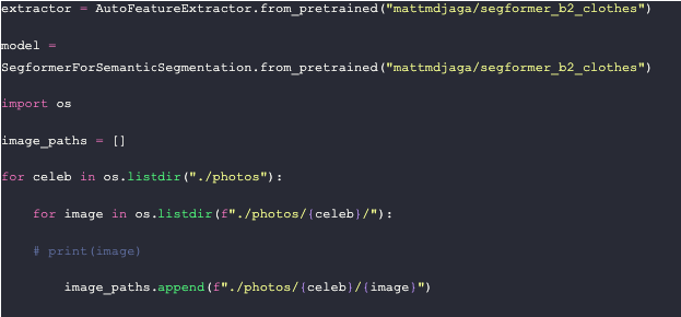 Remember that extractor and segmentation model we talked about earlier? This is where we use them. We use this pre-trained segformer model from Hugging Face. After loading the models, we put all the file paths into a list to loop through.