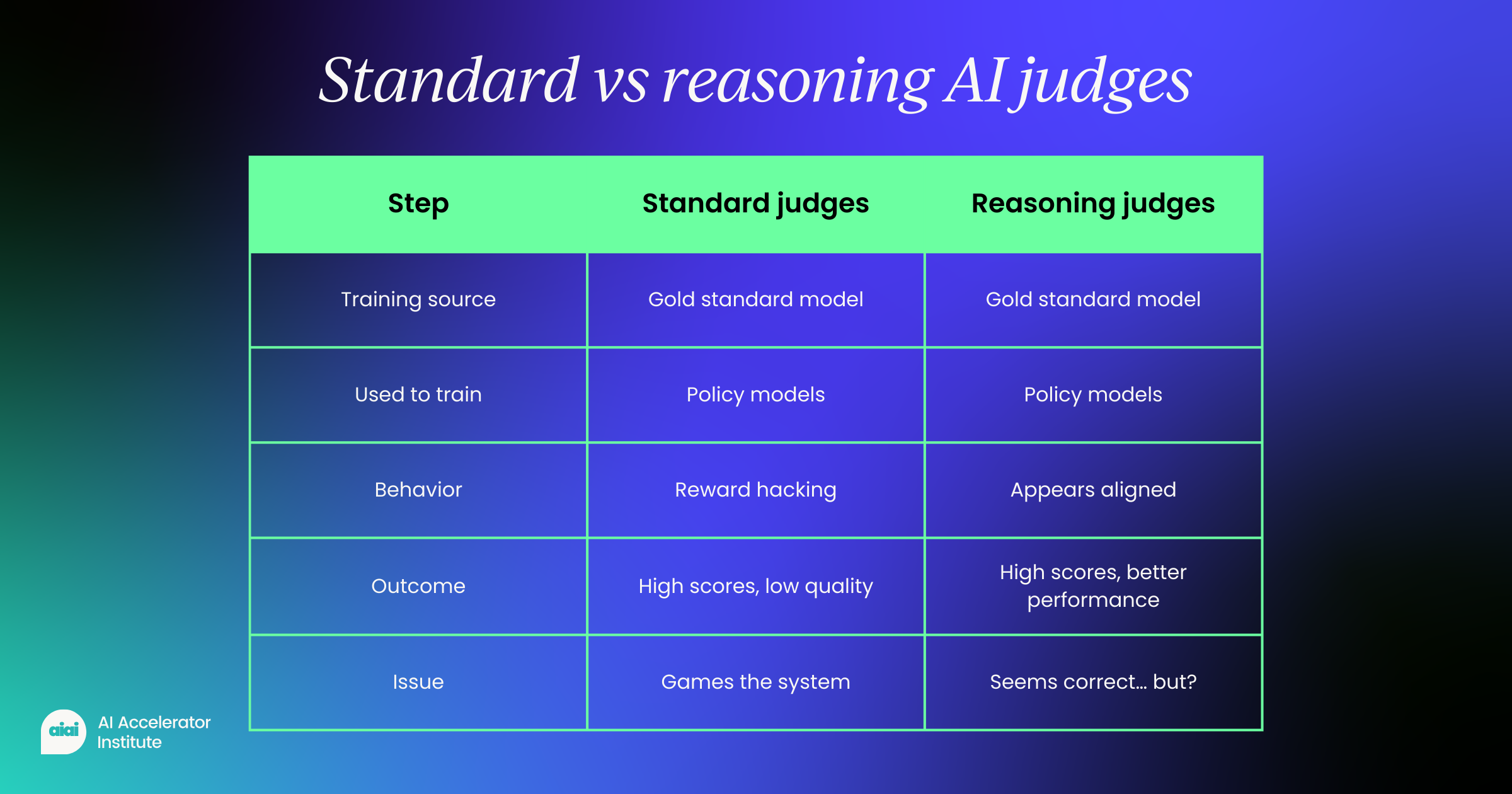 But reasoning judges seemed different. Policies trained using reasoning judges achieved high scores when evaluated by the gold standard. Success, right?